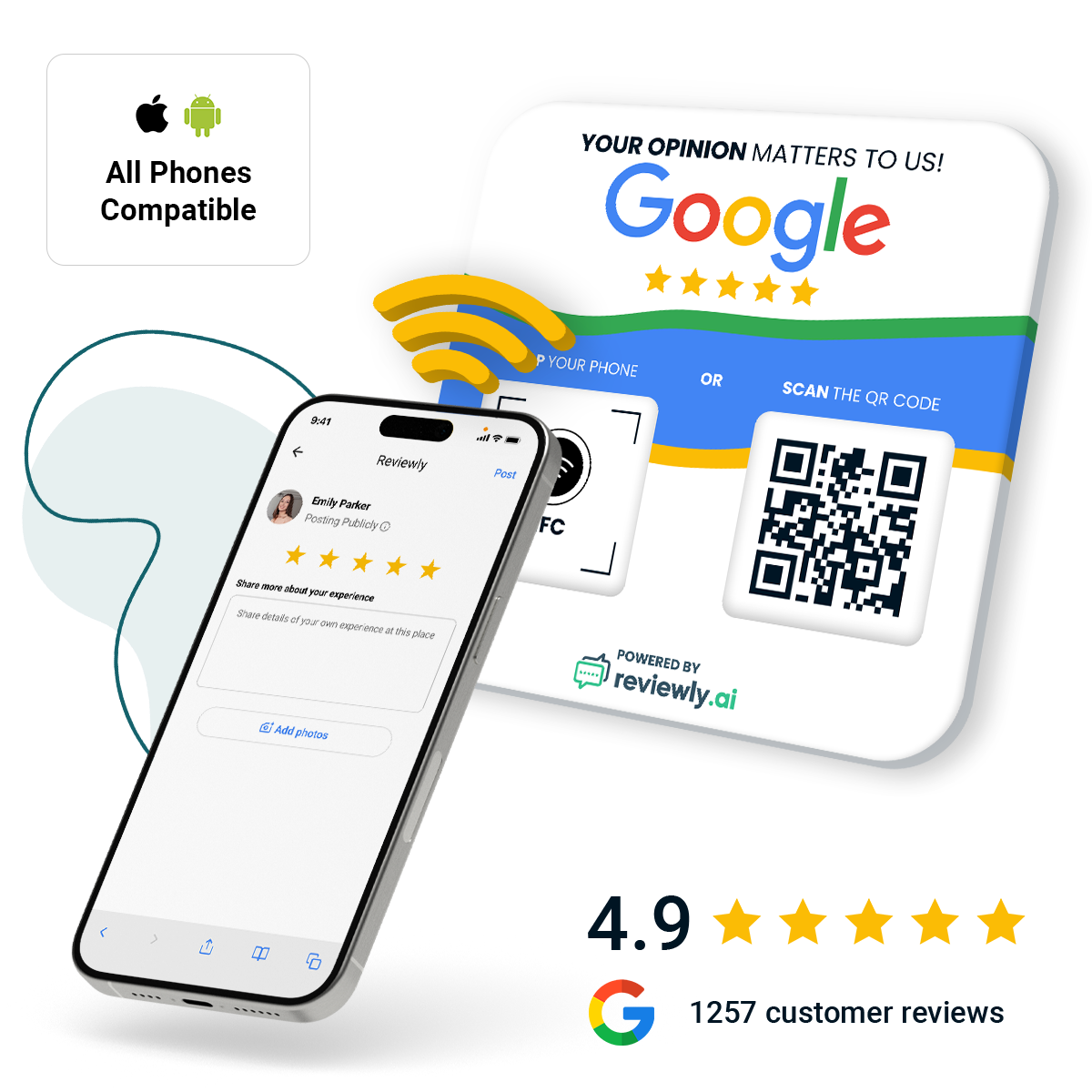 Reviews have a major impact on the growth of your business. To help you grow, our Reviewly Plates, Stickers, and Smart cards help your happy customers quickly and easily leave you 5 star reviews on your Google Profile!