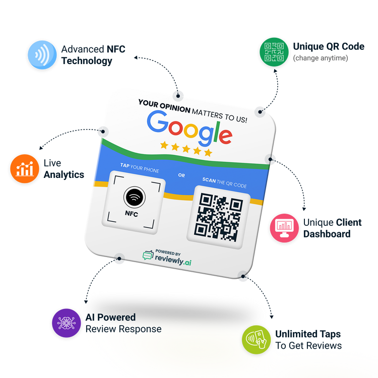 Reviewly products harness QR code and NFC technology to seamlessly guide customers to leave reviews, enhancing your online presence. Their easy-to-use design and AI-powered platform amplify positive customer feedback, directly boosting your visibility and reputation on the web.