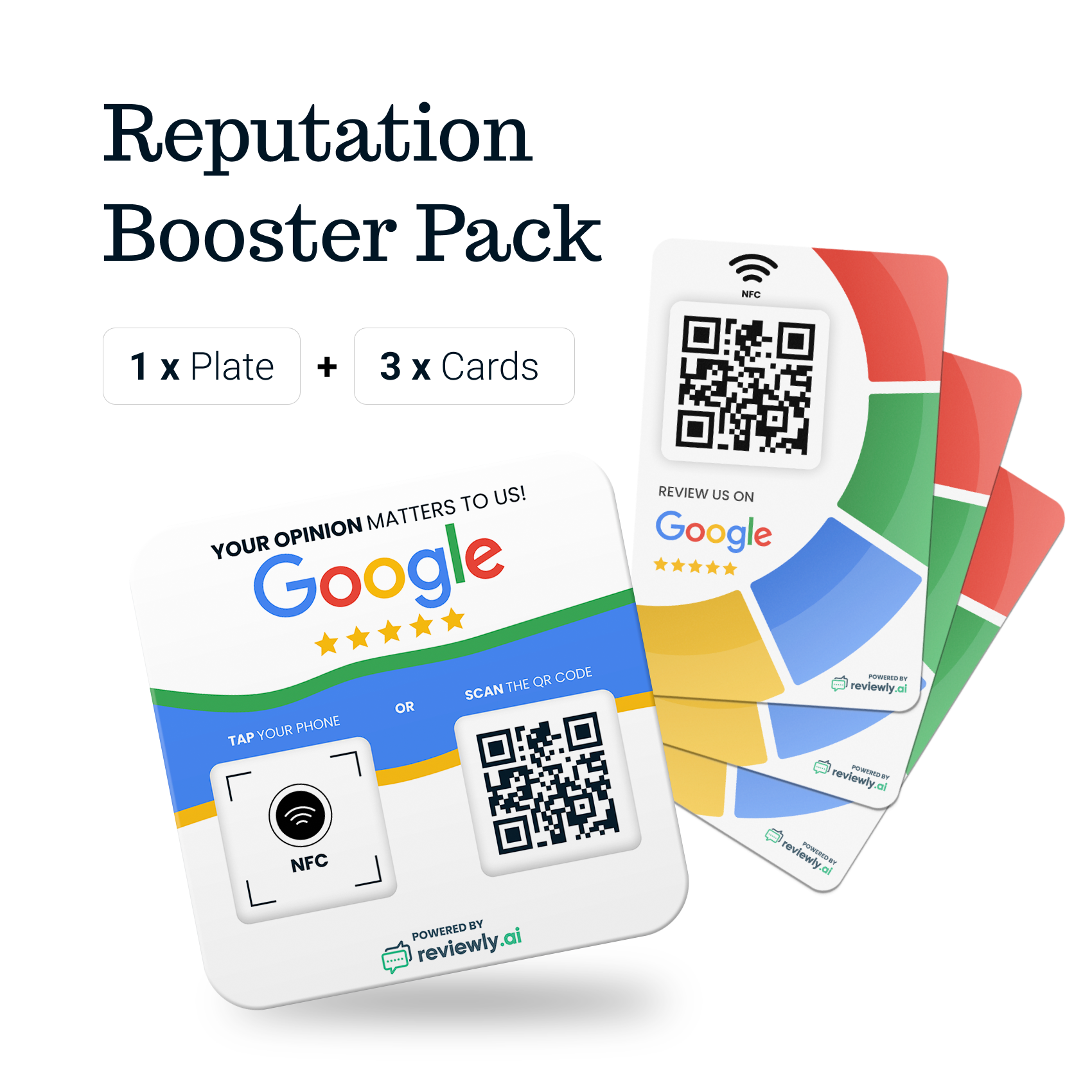 Elevate your business’s online presence instantly with our Reputation Booster Pack. This essential package combines a Reviewly Plate and three Reviewly Smart Cards, employing NFC and QR technology for seamless customer review collection.